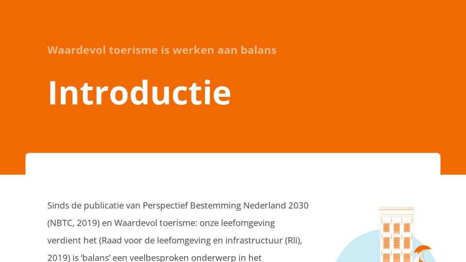 Sinds de publicatie van Perspectief Bestemming Nederland 2030 (NBTC, 2019) en Waardevol toerisme: onze leefomgeving verdient het (Raad voor de leefomgeving en infrastructuur (Rli), 2019) is ‘balans’ een veelbesproken onderwerp in het toeristische domein.