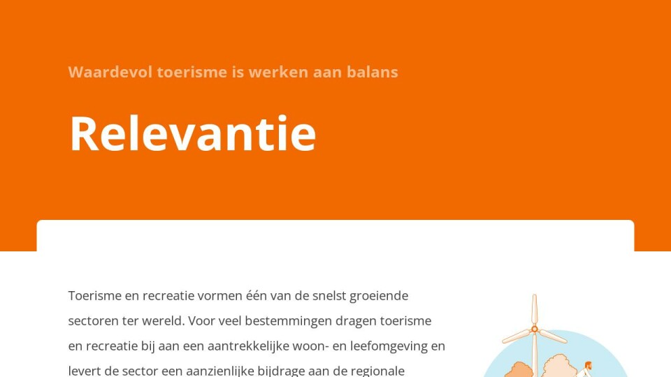 Toerisme en recreatie vormen één van de snelst groeiende sectoren ter wereld. Voor veel bestemmingen dragen toerisme en recreatie bij aan een aantrekkelijke woon- en leefomgeving en levert de sector een aanzienlijke bijdrage aan de regionale economie en werkgelegenheid.